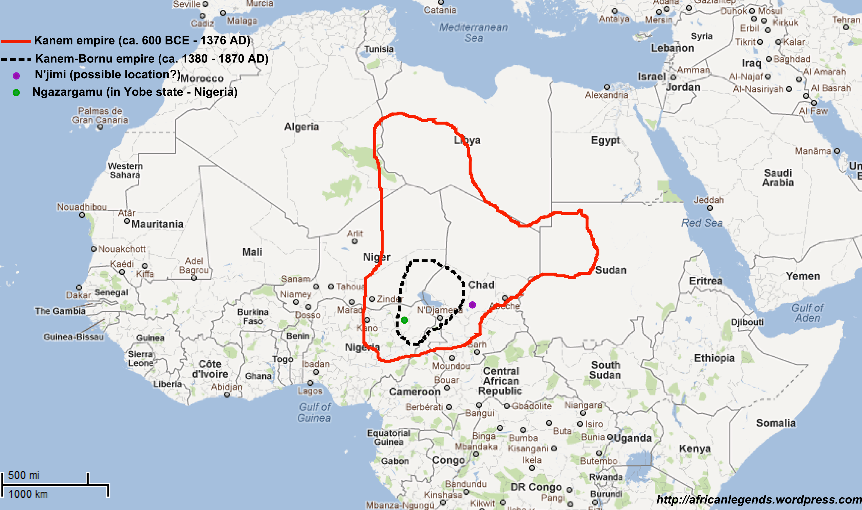 To learn more about the Kanem-Bornu empire, check out: Jamtan.com, Daily Kos- Ancient Africa, BlackPast.org, The empire by the lake. Don’t forget to check out the book “Kanem-Borno: One Thousand Years of Splendor (Kingdoms of Africa)” by Philip Koslow. Back in those days, Lake Chad covered an area of about 10,000 m2… today it has sadly shrunk down to 1,300 m2, and is still shrinking! I could not find a really good map of the Kanem or Kanem-Bornu empire, so I used Google maps and known maps from history books to make my own with some of the boundaries cited earlier. I have overlaid the Kanem and the Kanem-Bornu empires on the same map to give a better idea. Enjoy!