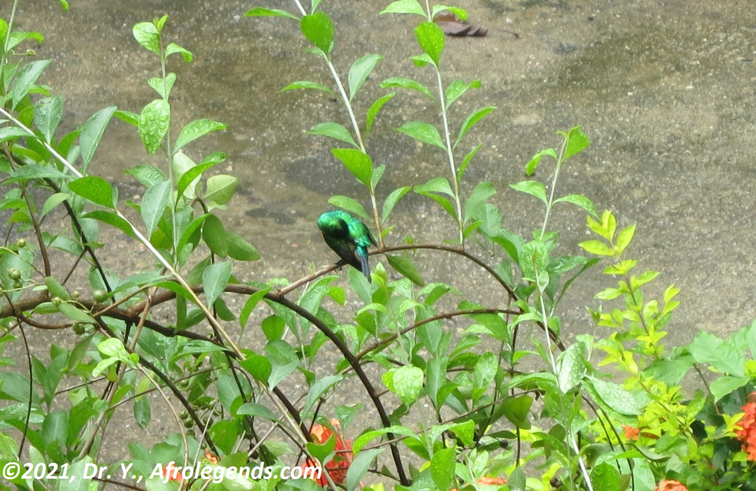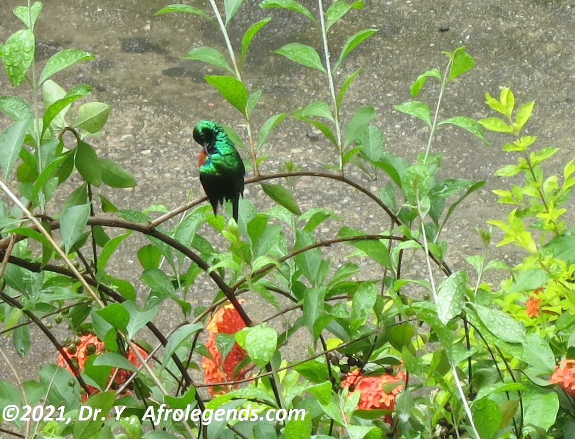 I just found another species of birds in my mother’s garden. It is called the Souimangain Malagasy which has been adopted as its name in French, or simply sunbird in English. In the case at hand, it is the Souimanga bronzé or bronzy sunbird known by its scientific name as Nectarinia kilimensis; it is very close to the Souimanga de Mariqua or Marico sunbird. It is native of Sub-Saharan Africa. Its coat is quite shiny and irridescent. Its flight is quick, similar to the American hummingbird. As you can see, this pretty visitor has a shiny green coat sparsed with black, and a red underbelly; it feeds on flower nectar. The shiny metallic color indicates that our visitor is a male. Enjoy!