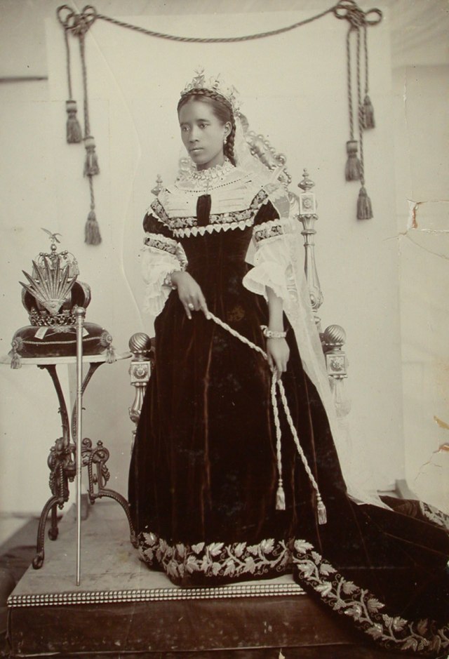 Queen Ranavalona III in full regalia, standing beside a throne table on which are the Royal crown and sceptre, ca 1890 – 1895