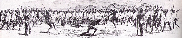 Reception of the Zulus for Chaka from Isaacs’s book Travels and Adventures in Eastern Africa. Descriptive of the Zulus, their manners, customs, with a sketch of Natal.