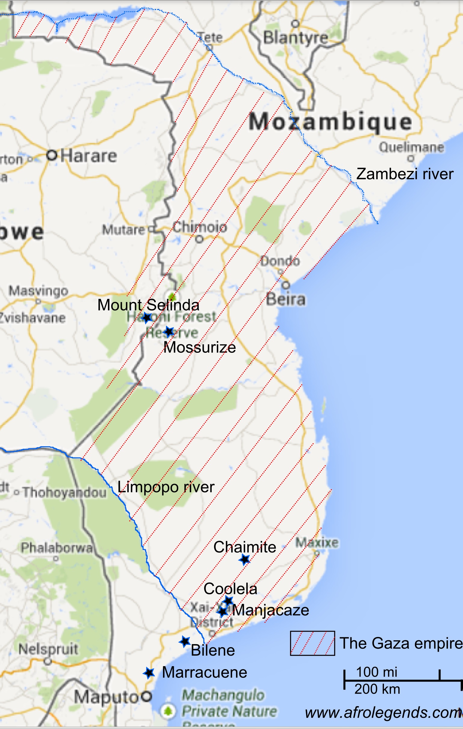 Following up on Gungunyane, the Lion of Gaza, I propose here maps of his kingdom before and after the migration. I found a map of Gungunyane‘s kingdom, the Gaza empire, after migration from Mount Selinda, in ‘Les Africains,’ Vol. 3, P. 181, C. Julien, Editions J.A., 1977. I also made an approximative map of what would have been the Gaza empire at its heights in 1860s, before migration, using the well-known boundaries of the Zambezi and Limpopo rivers, and Mount Selinda (in modern day Zimbabwe) as well as the city of Mossurize in Mozambique. Enjoy!