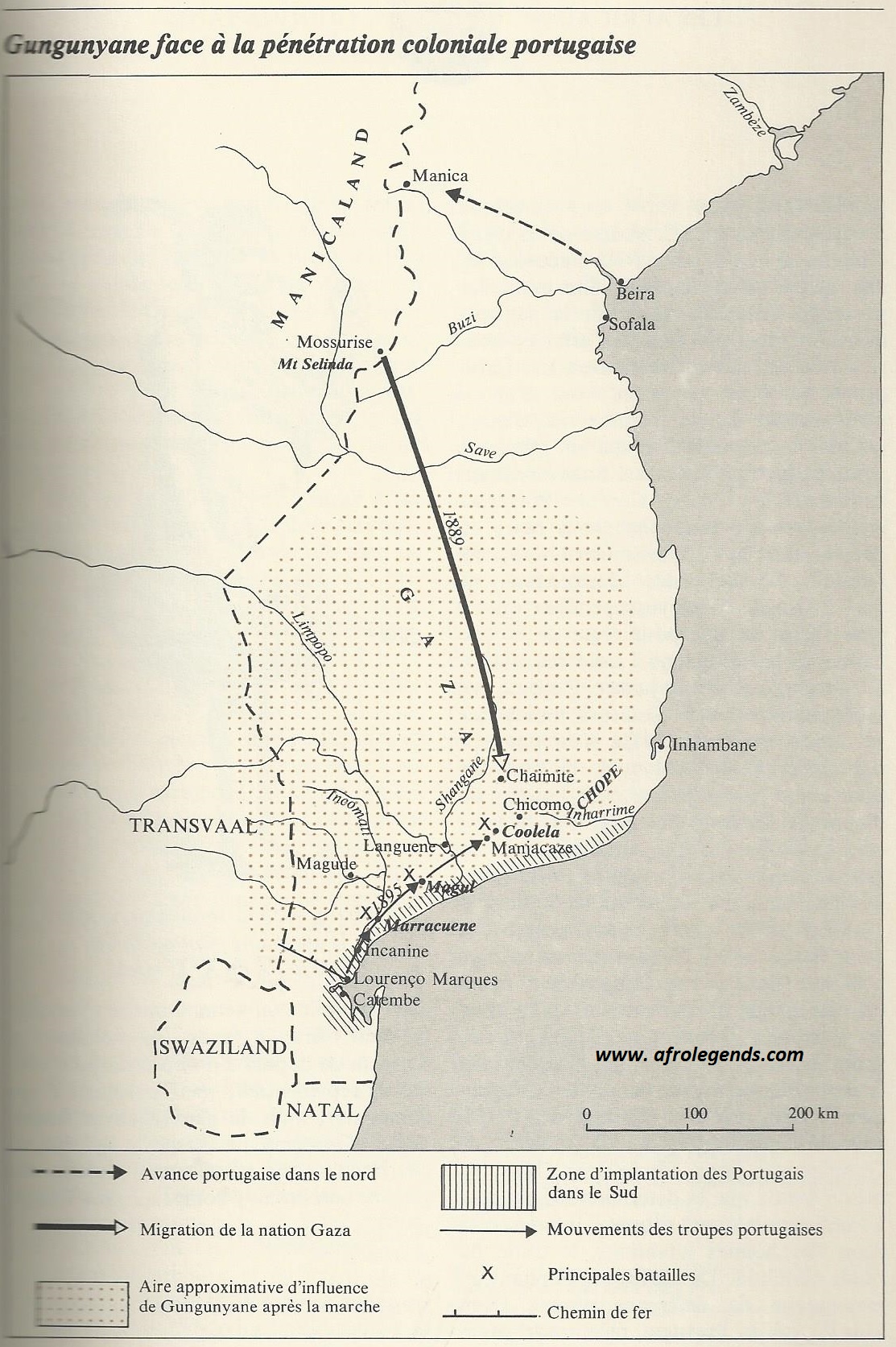 The Gaza empire after migration in 1889 (Source: Les Africains, Vol 3, P. 181, C. Julien, Ed. J.A., 1977)The Gaza empire at its heights around 1860s