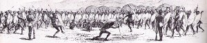 After his initiation ceremony in 1804, he took the name of Letlama, the Binder, and later chose the name Moshoeshoe, a name inspired by the sound of shaving – symbolizing his skill in cattle raids and leadership. It is said that it was chosen after a successful raid in which he had sheared the beards of his victims – the word ‘Moshoeshoe’ representing the sound of the shearing.